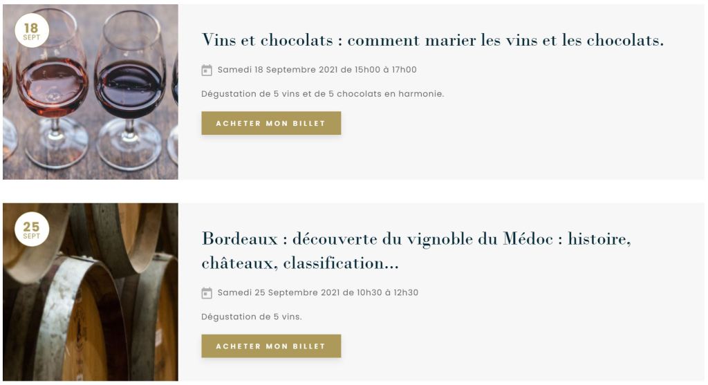Voici le planning complet des cours et des évènements au Musée du Vin de Paris : https://www.museeduvinparis.com/cours-de-degustation/